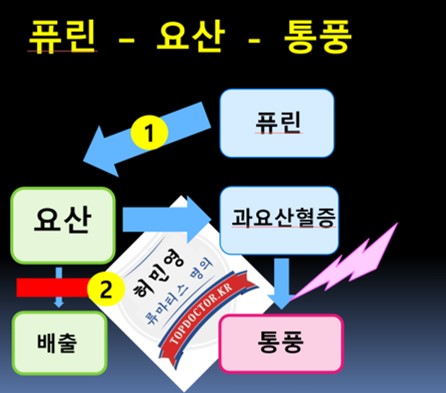 즉 요약하면 통풍은 퓨린이 대사되는 여러 단계 중에서 착오가 생기는 경우