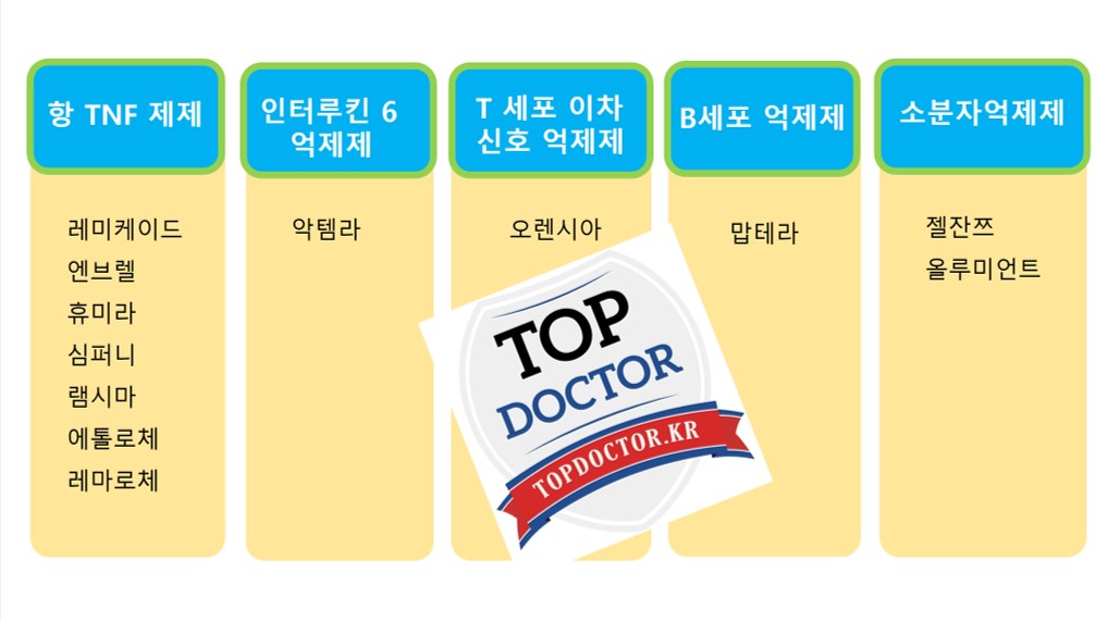아달리무맵 (휴미라), 인플릭시맵 (레미케이드, 램시마, 레마로체), 에타너셉트 (엔브렐, 에토롤체), 골리무맵 (심퍼니), 아바타셉트 (오렌시아), 리툭시맵 (맙테라), 그리고 토실리주맵 (악템라) 등의 주사약제들이 있고 경구용 약제인 소분자 제제로서 젤잔즈, 올루미언트 등의 약제 등이 있습니다.