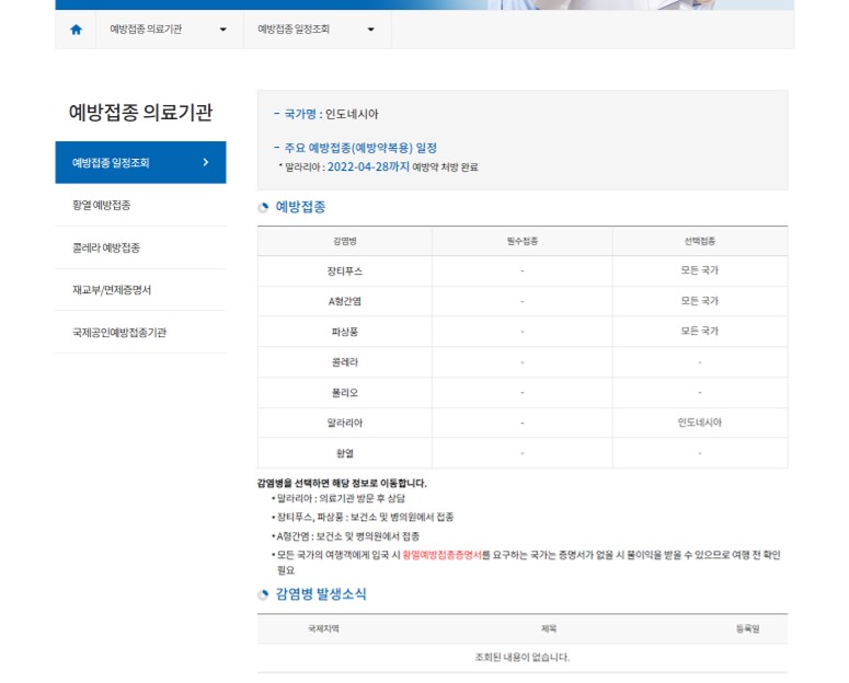 예방접종 일정 조회로도 어느 정도는 정보를 알 수 있지만 국가별 감염병 예방정보를 보면 좀 더 자세한 정보를 얻을 수가 있습니다다.