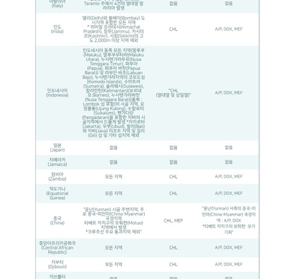 다음과 같이 국가에 따라 말라리아 유행및 예방약제를 정리해 놓은 것을 볼 수 있습니다.