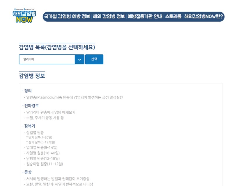 해외감염병 NOW 웹사이트에서는 각각의 유행감염병에 따라 질환과 예방약제를 정리해 놓았습니다.