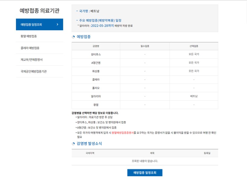 아래 그림처럼 일정조회 웹사이트에 국가검색에 베트남을 입력하고 여행을 떠날 날짜를 넣습니다.