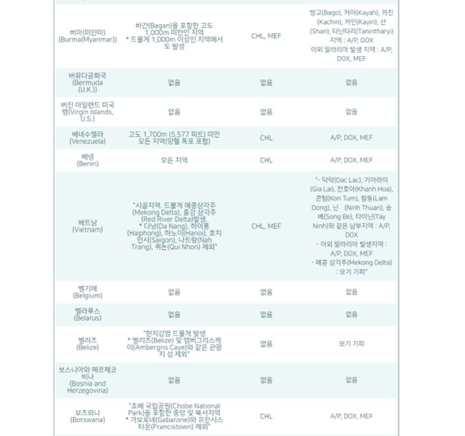 다음과 같이 국가에 따라 말라리아 유행및 예방약제를 정리해 놓은 것을 볼 수 있습니다.